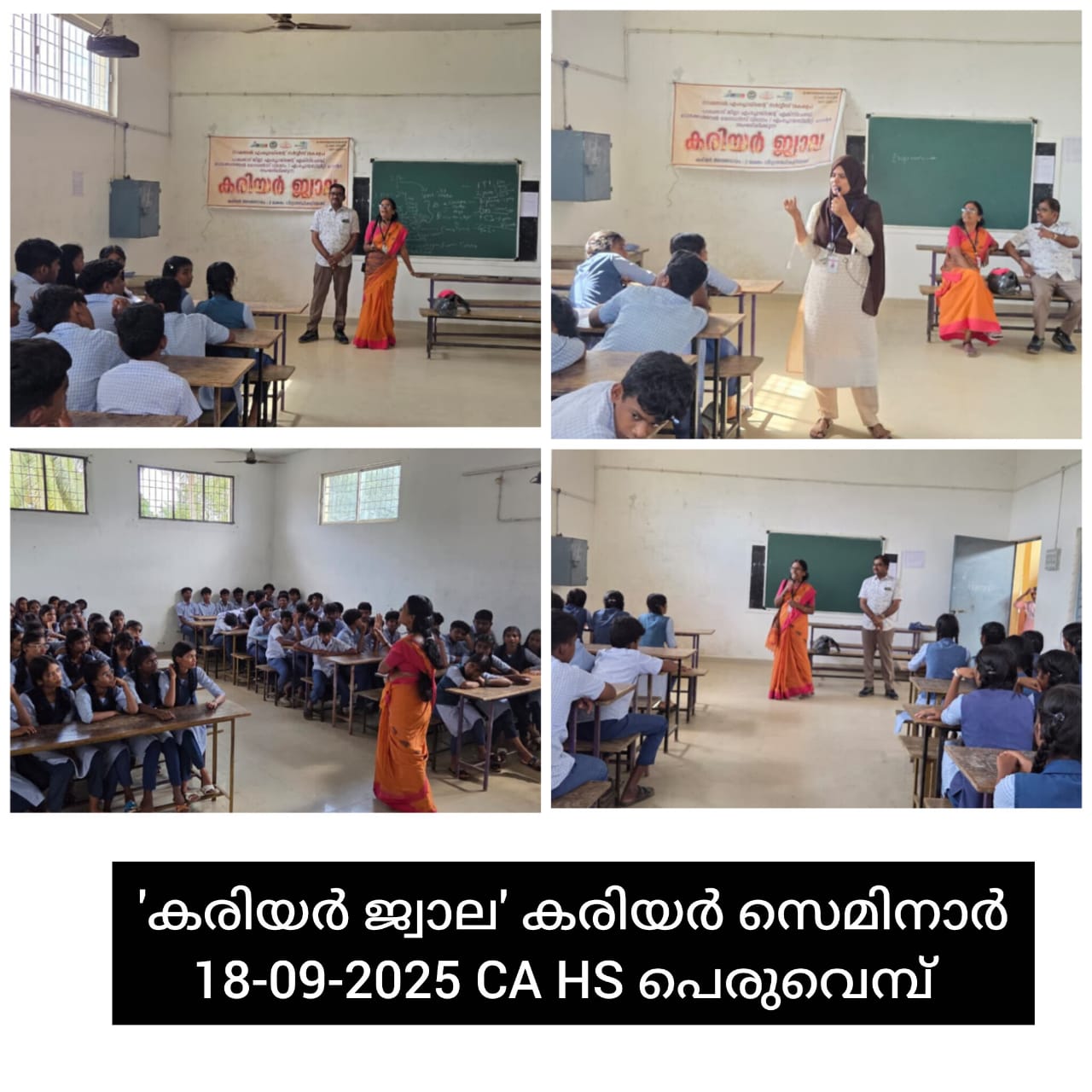2 ലക്ഷം വിദ്യാർത്ഥികൾക്ക് കരിയർ അവബോധം നൽകുക എന്ന ലക്ഷ്യത്തോടെ 2025-26 സാമ്പത്തിക വർഷത്തെ ആക്ഷൻ പ്ലാനിൽ ഉൾപ്പെടുത്തി നാഷണൽ എംപ്ലോയ്മെന്റ് സർവീസ് (കേരളം) വകുപ്പ് നടത്തുന്ന ‘കരിയർ ജ്വാല’ എന്ന പദ്ധതിയുടെ ഭാഗമായി പാലക്കാട് ജില്ലാ എംപ്ലോയ്മെന്റ് എക്സ്ചേഞ്ച് വൊക്കേഷണൽ ഗൈഡൻസ് യൂണിറ്റിന്റെ ആഭിമുഖ്യത്തിൽ 18-09-2025ന് പെരുവെമ്പ് CA ഹയർ സെക്കൻഡറി സ്കൂളിൽ വെച്ച് കരിയർ സെമിനാറുകൾ സംഘടിപ്പിച്ചു.